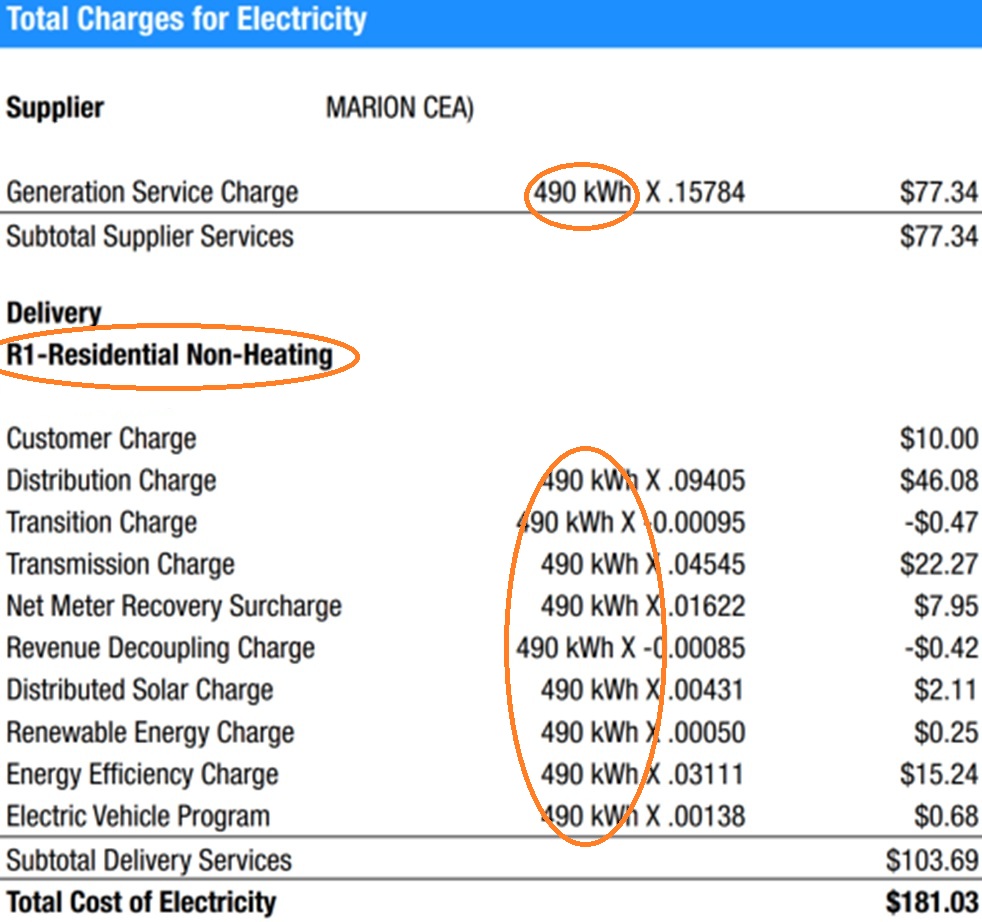 The image to the right is cut from an Eversource electricity bill, and looks like that of most “”R1” home owners on the South Coast of Massachusetts. There may be some differences, like electricity generation supplier, but most folks are structurally the same.